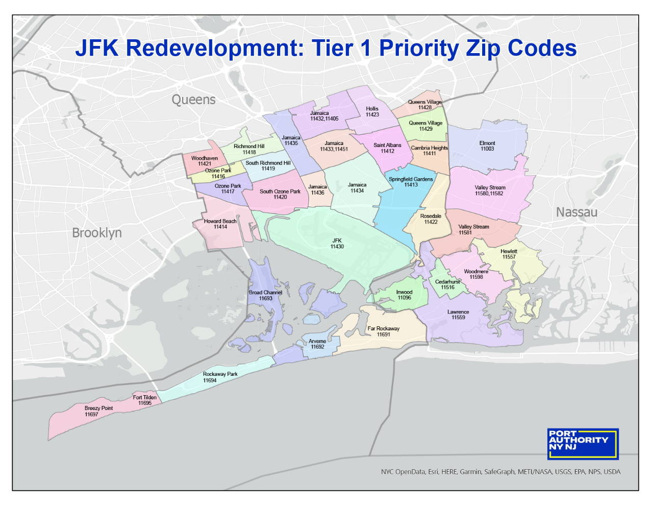 11405, 11411, 11412, 11413, 11414, 11416, 11417, 11418, 11419, 11420, 11421, 11422, 11423, 11428, 11429, 11430, 11432, 11433, 11434, 11435, 11436, 11451, 11691, 11692, 11693, 11694, 11695, 11697, 11559, 11598, 11096, 11516, 11557, 11003, 11580, 11581, 11582 (the “Tier 1 Zone”); and as a second priority, LBEs located within the Borough of Queens, New York (the “Tier 2 Zone”).